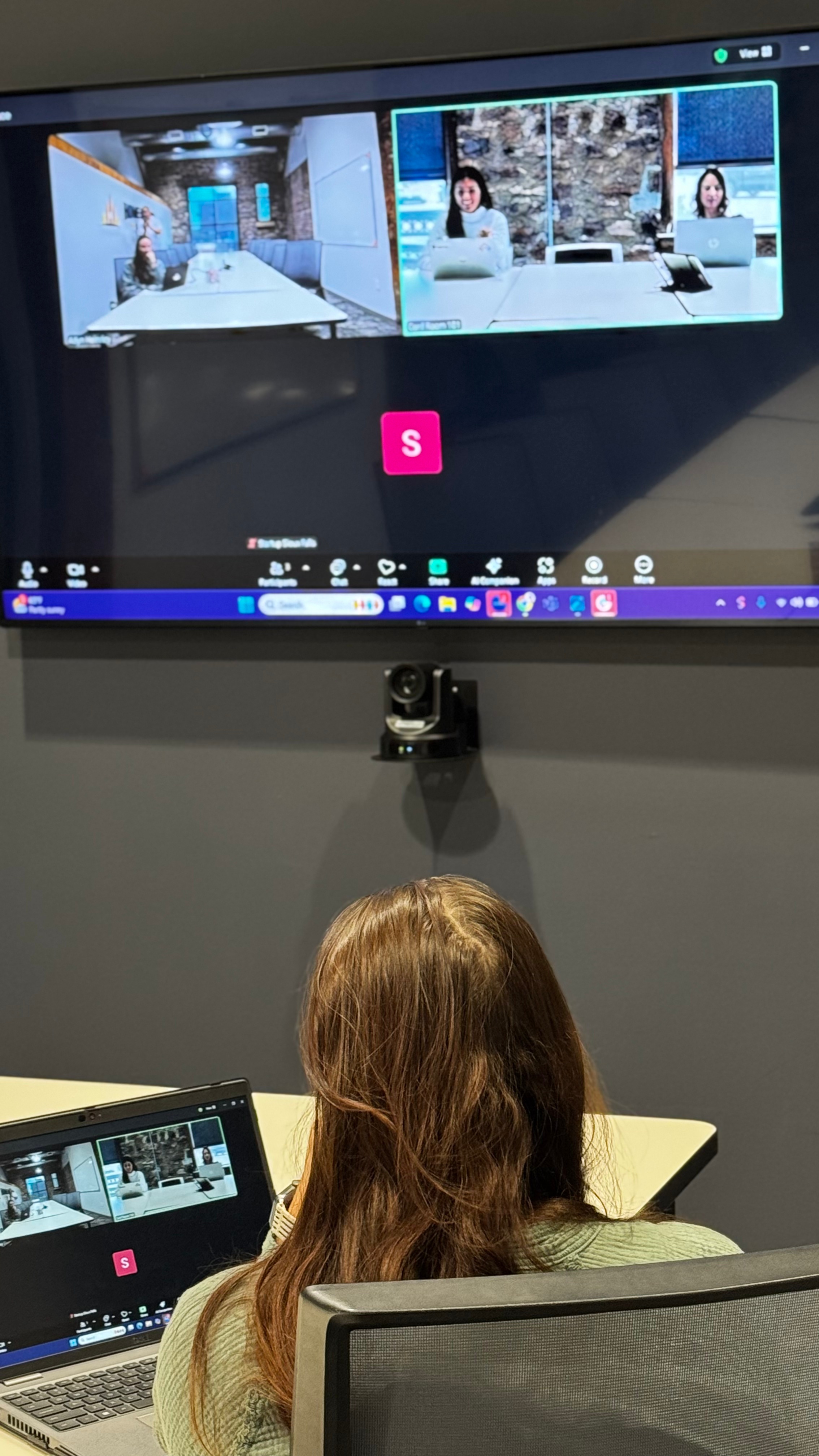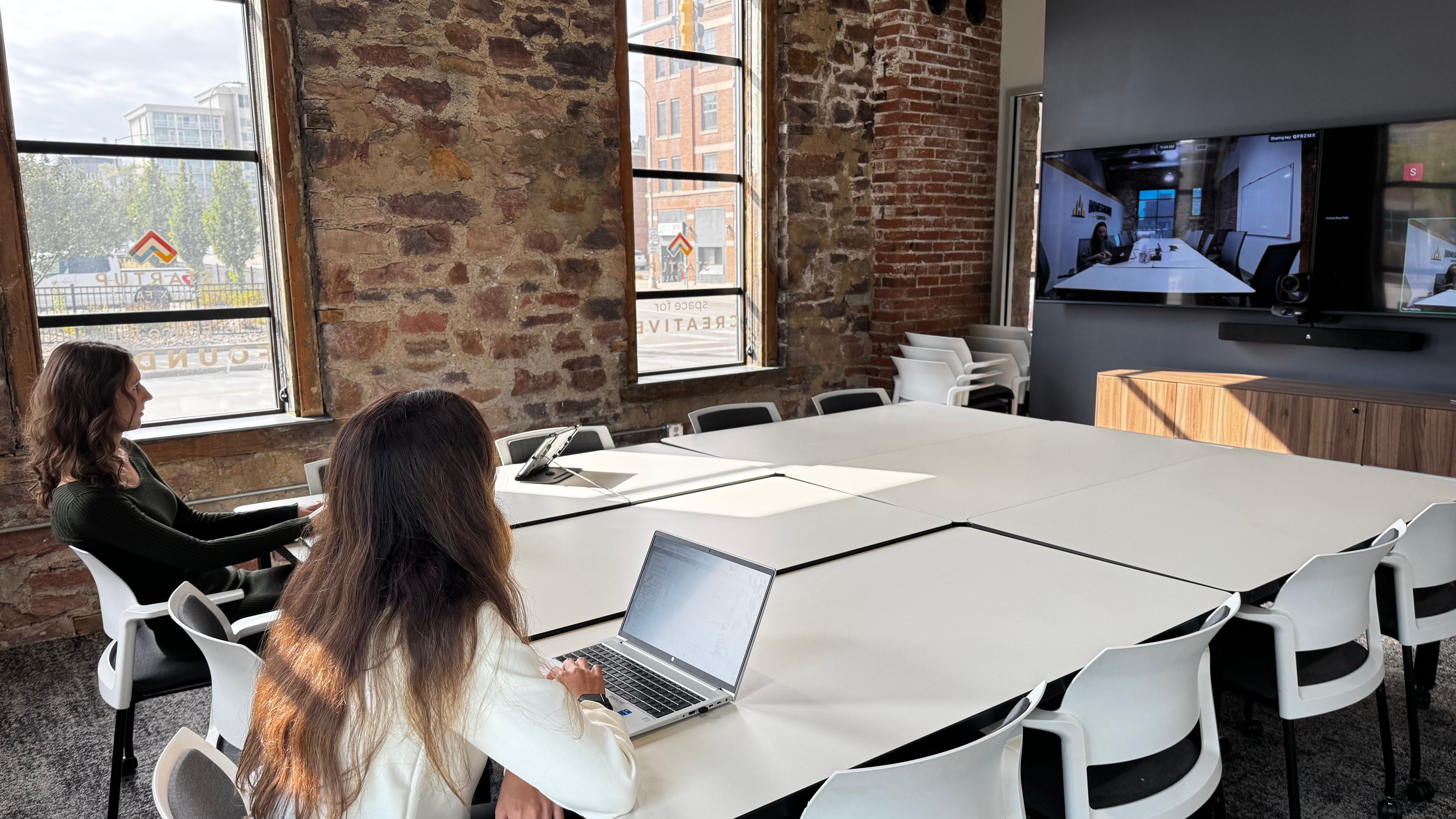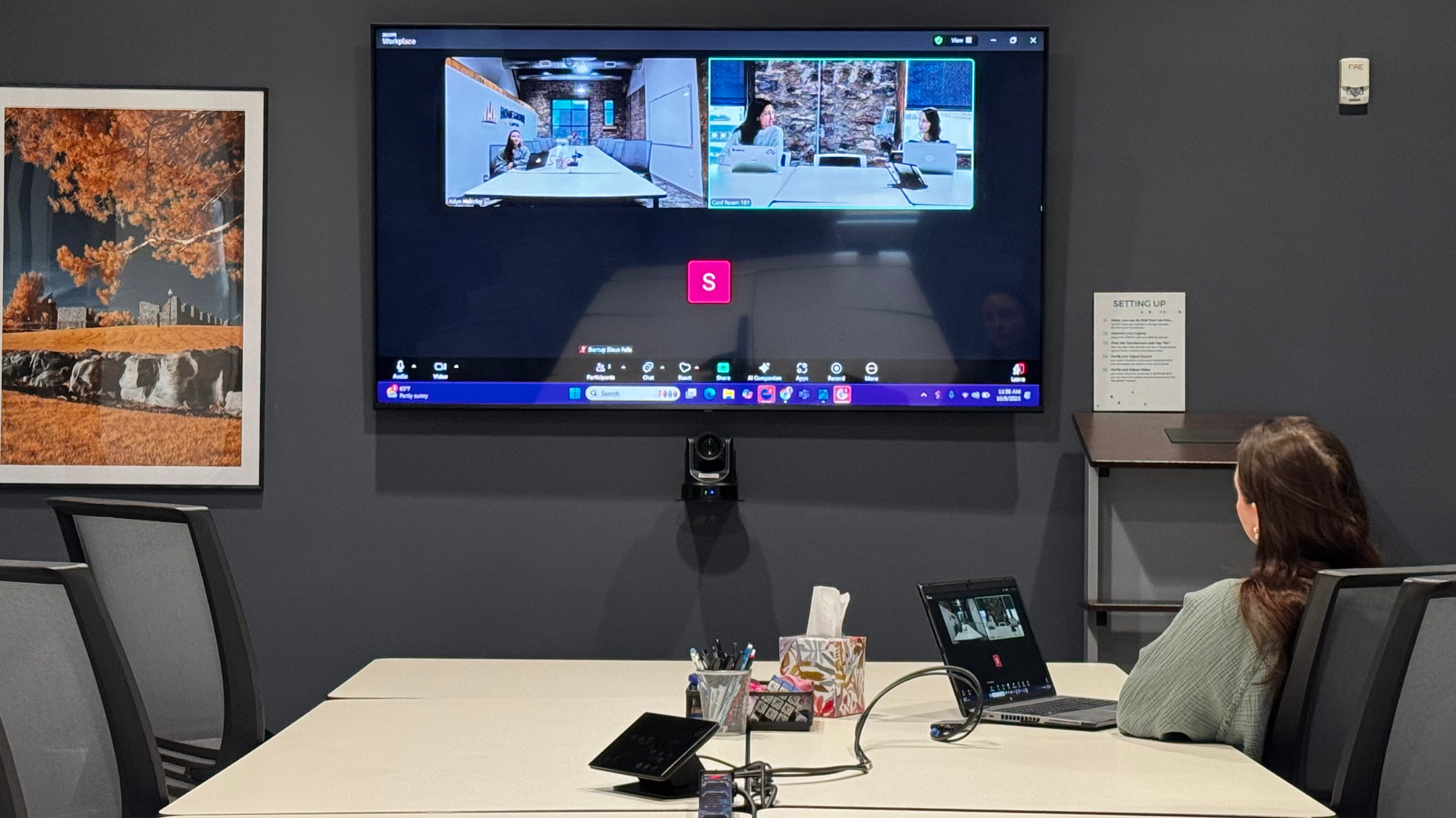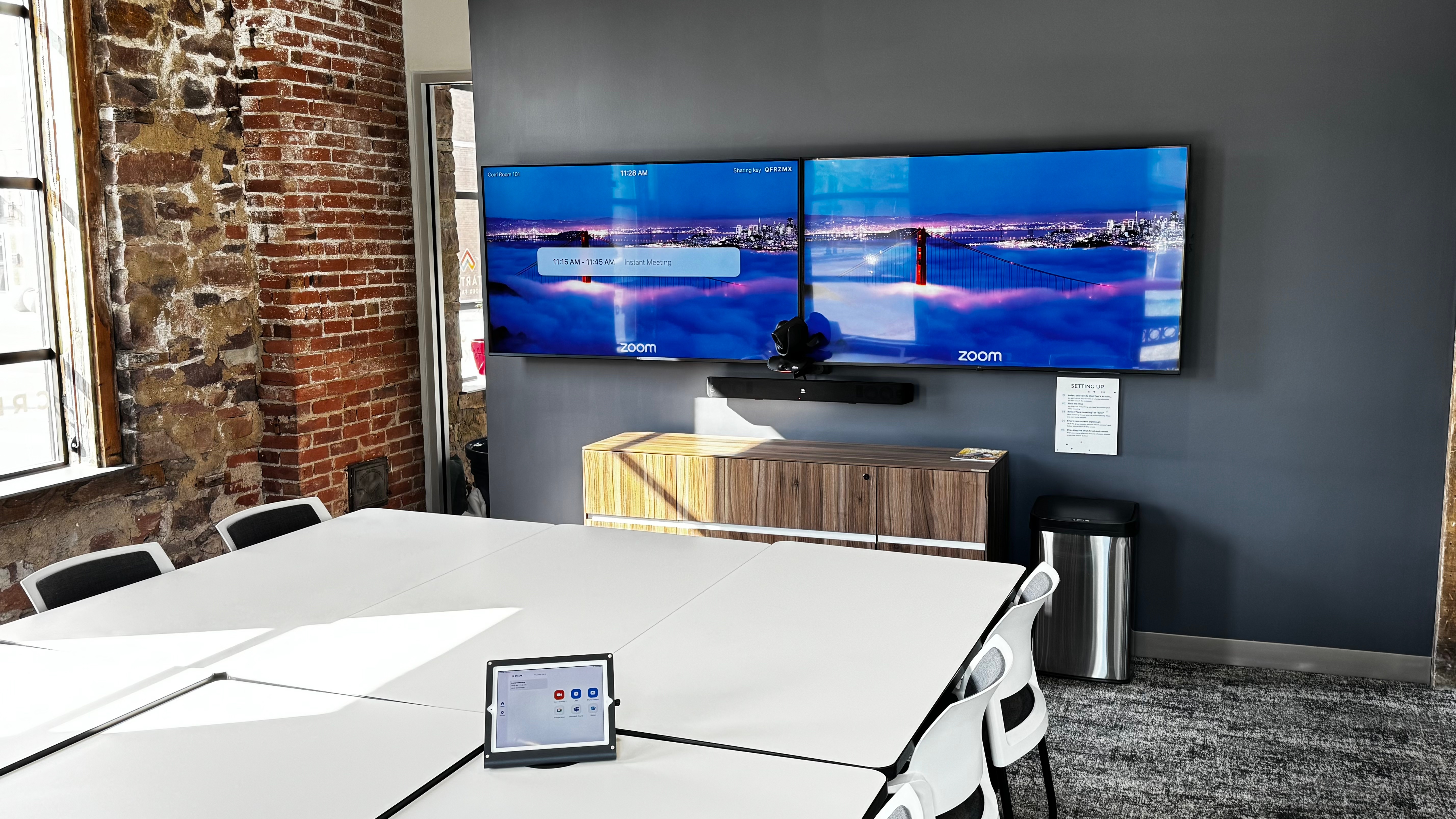 Sidewalk Technologies designed a new Zoom Room system featuring dual 85-inch displays with a wide-angle Huddly L1 camera and a second rear camera for presentations. We overhauled the audio with advanced Yamaha ceiling microphones and Yamaha Line Array speakers, which provide uniform sound that appears to come directly from the remote participants on screen. The new automated system “just works,” allowing users to walk in and start a meeting in less than five seconds.